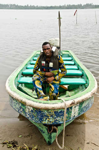 | A resourceful hitchhiker-cum tour guide, seated on a rickety boat. He offered to facilitate the ride across the water to the infamous 'Point of No Return' (behind him; in the forest, top right corner of the frame) |