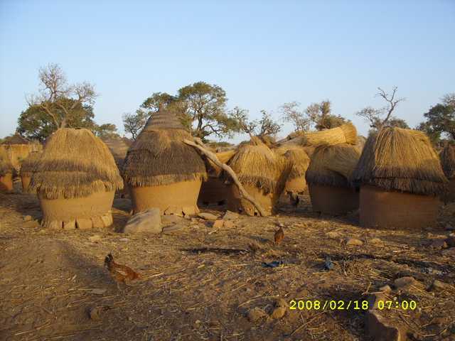 | Grain silos used to store grain throughout the year in Chatur village. They are made from mud and thatch roof. |