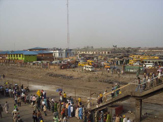 | Pedestrians lining up patiently to take the previously abandoned pedestrian overhead bridge at Oshodi. |